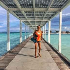 瞿颖在微博晒出在马尔代夫度假照片,她身穿橘黄色吊带和蓝色牛仔短裤,大秀修长美腿。看看人家那么长的腿,还要踮脚呢!不过这搞怪的表情~~(女神你的偶像包袱呢?)