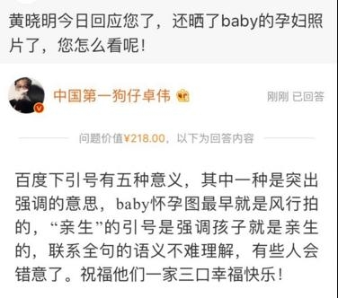 但是扒哥觉得,你这反正带了引号,到时候就算黄晓明和Baby怎么回应你都能解释的通,明明就是想误导大家说Baby代孕,不然好好的说话为什么要加个引号?现在晓明回应了你又出来说其实是祝福,不是扒哥这次不顶你啊,祝福个鬼啊!太假了吧!