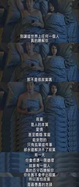 寂寞是人的本质,爱情甚至婚姻、家庭,能安慰的只有孤单这件事,却永远解决不了寂寞,有一天,你会悟透一个道理,就算有一个人真的百分百了解你,你依然不会停止寂寞,所以害怕寂寞是最愚蠢的念头