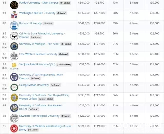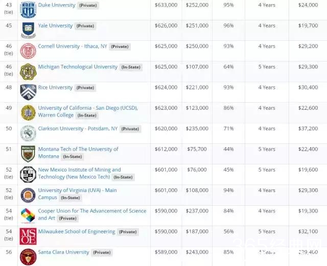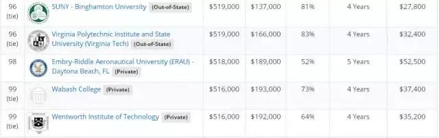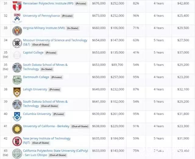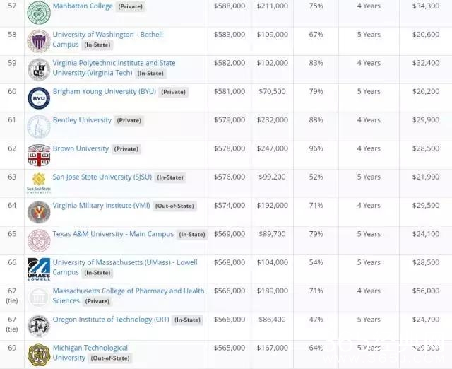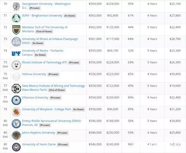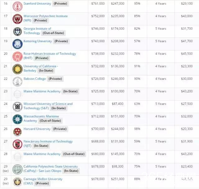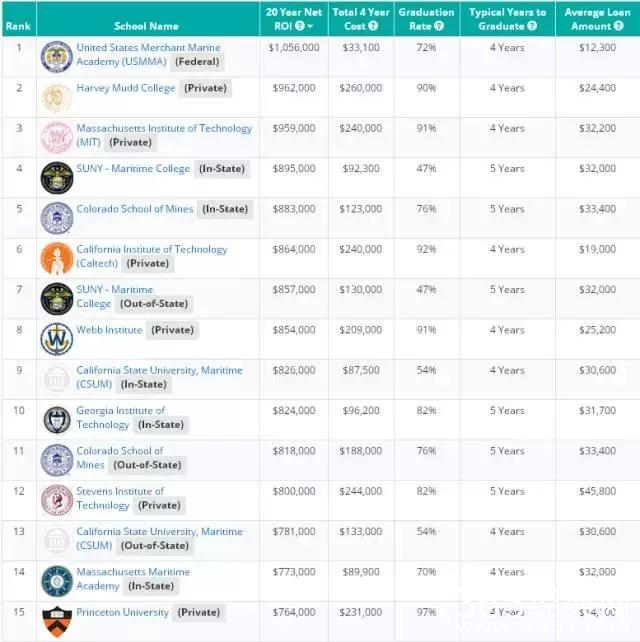 文章的最后,附上美国著名的薪酬公司Payscale发布了2017年美国大学教育投资回报率排名。该排名比较了美国大学20年的投资回报、4年的总花费、毕业率等因素