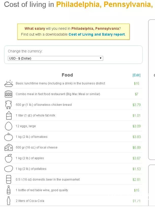 宾州的物价在美国属于中下,费城的物价较之于纽约、旧金山、华盛顿、洛杉矶、波士顿之类的城市也是低了不少,如下图所示: