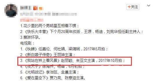 赵丽颖将搭档朱亚文一起合作电视剧《我站在桥上看风景》。电视剧将于十月开拍