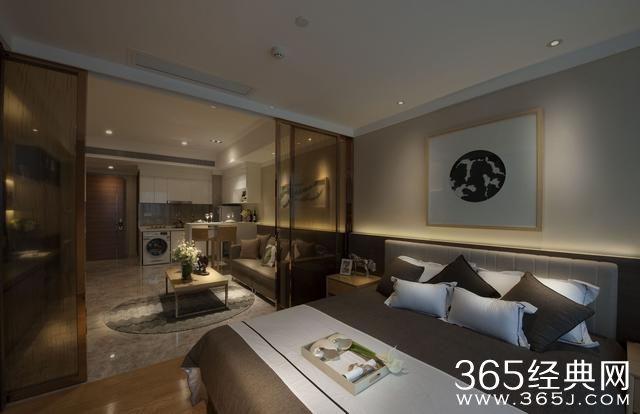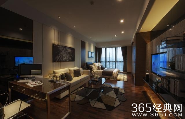 公共区域和卧室区做了一个小小的隔断,方便会客。整个空间的灯光和木质家具的搭配显得比较有亲和力。