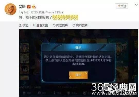 可怜的吴昕由于经常被举报,再次被封20多个小时。她在微博向网友们诉苦:“能不能别举报我了”。从吴昕所放出来的截图中可以看到,消极比赛(挂机)、被举报、信誉积分被扣光了,被禁止参与多人匹配和排位赛。能被那么多玩家同时举报,看来吴昕也是坑得有一定水平。