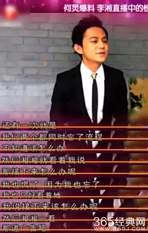 主持时,会出现各种各样的突发情况,这时候最怕冷场,何炅爆料有一次直播两人都忘记流程,慌了不知道怎么办,李湘立马接:“那下面进一段广告吧。”