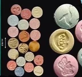 酒吧、KTV、夜店等涌动的人流中总能看到它的身影。如同上述麻古的片剂外形类似,但色彩较为多样化,其主要成分是 MDMA(3,4-亚甲基二氧甲基苯丙胺)、 MDA(4,5-亚甲基二氧基苯丙胺)、AM(苯丙胺)及 MAM(甲基苯丙胺)等,也就是说,摇头丸也是一种人工合成的苯丙胺类兴奋剂型毒品。