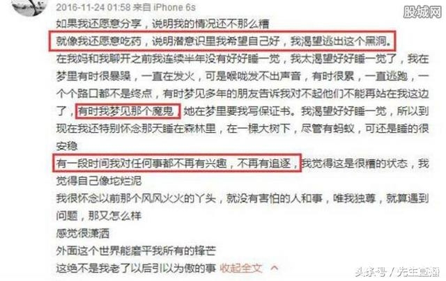 已经很明显了,她患上了抑郁症。下面是她在今年2月25日分享的有关抑郁症的微博,她透露自己曾经陷入“深渊”,“庆幸有人把我拉了出来”,这个“深渊”,应该指的是自杀。值得一提的是,在微博最后,她透露自己已经治愈了。
