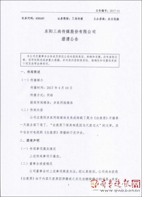 在此公告中,三尚传媒否定了“白鹿原下架是因为尺度过大”以及该剧后续将无法播出的传闻。