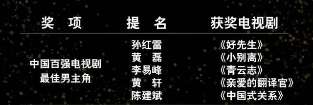 2.中国百强电视剧最佳男演员:李易峰《青云志》、孙红雷《好先生》、黄磊《小别离》、黄轩《亲爱的翻译官》、陈建斌《中国式关系》