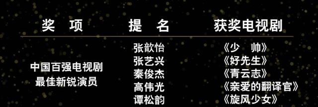 3.中国百强电视剧最佳新锐演员:张艺兴《好先生》、谭松韵《旋风少女》、高伟光《亲爱的翻译官》、秦俊杰《青云志》