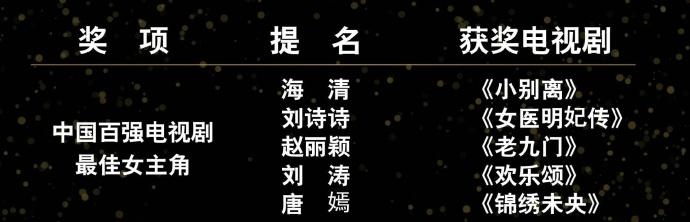 1.中国百强电视剧最佳女主角:赵丽颖《老九门》、刘诗诗《女医明妃传》、唐嫣《锦绣未央》、刘涛《欢乐颂》、海清《小别离》
