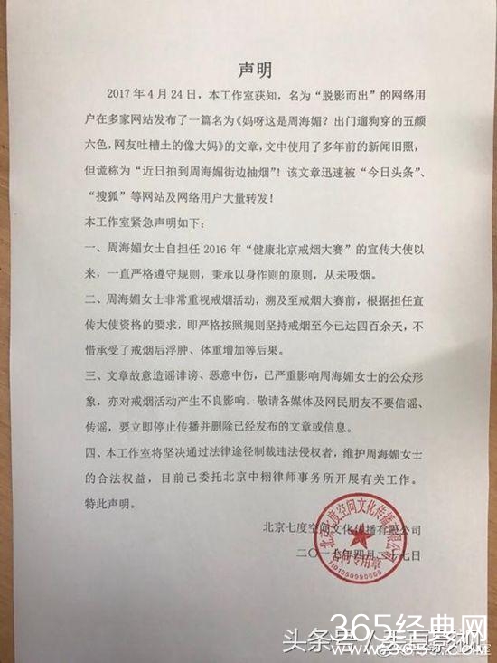 近日,有网友在各大网络平台上发布了一组周海媚吸烟的图片,被网友纷纷吐槽即是戒烟大使,自己又吸烟。28日,周海媚工作室在微博上发布声明,明确表示该组照片为早期旧照,有人恶意散播谣言,并劝诫各大网络平台删除有关吸烟照的谣言文章,否则当用法律手段来维护自己的名誉。