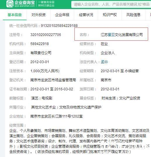 2012年3月,41岁的孟非成立了以他女儿名字命名的江苏星亚文化发展有限公司,由此开启了创业投资之路。该公司主要从事影视文化项目投资,法人代表为孟非,经纪人刘葆琪任总经理,起初的注册资本为200万元,后来增至1000万。2015年1月底,星嘉盟影视文化东台工作室(有限合伙)成立,江苏星亚文化发展有限公司便是该公司的法人代表。