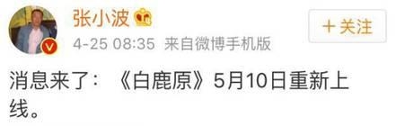 日前毫无征兆突然停播的电视剧《白鹿原》或将于5月10日重新上线。