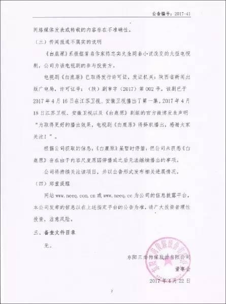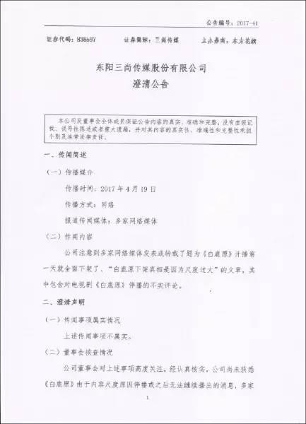 4月22日,《白鹿原》出品方之一的三尚传媒也发布公告,否定了“白鹿原下架是因为尺度过大”以及该剧后续将无法播出的传闻。