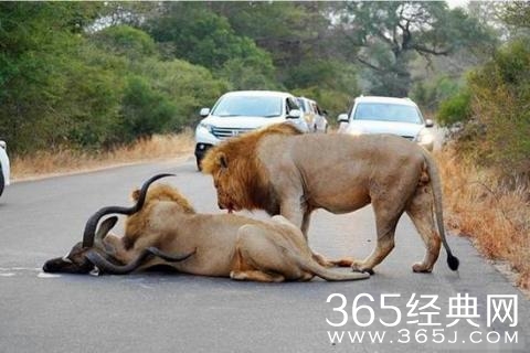 之后两头狮子就当着大家的面开端分享美食,而车内的人们都不敢开窗,只要一位大胆的小姑娘探出头去察看它们。觉得这样近间隔察看一遍狮子的捕食也是挺触目惊心的,不过平安起见,还是别乱开窗的好。