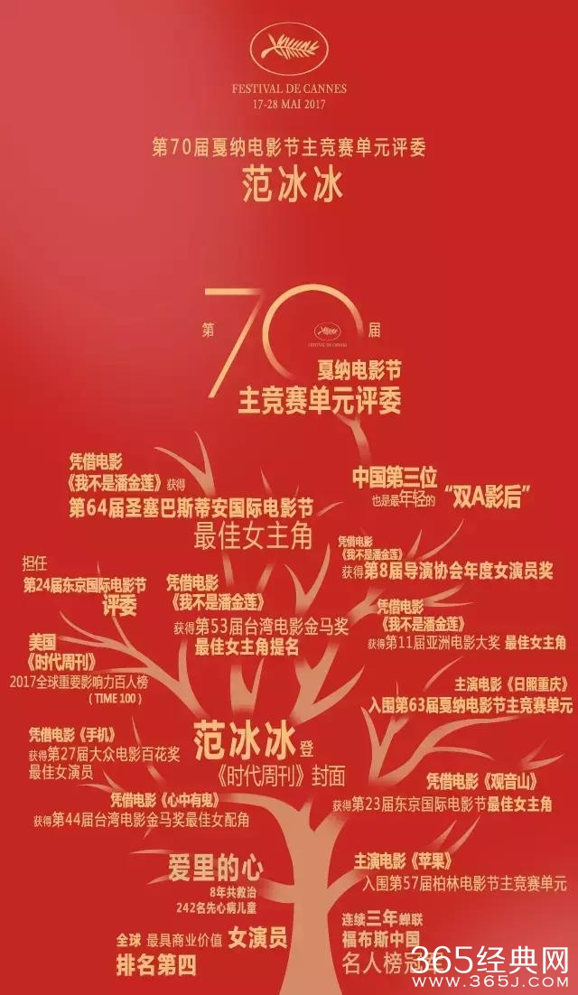 这样的履历自然是不言而喻!而戛纳50周年有巩俐,60周年有张曼玉,现如今70周年有范冰冰!十年属于华人的电影光彩。
