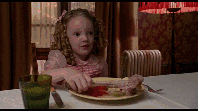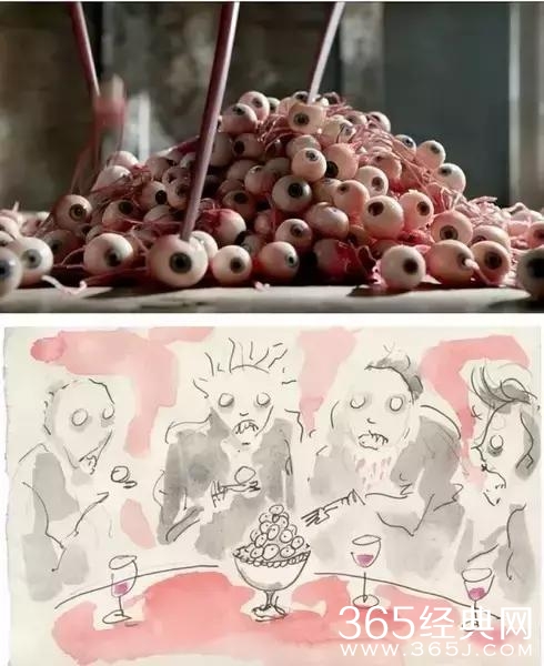 是几个反派对着一盘小孩儿的眼珠子大快朵颐的场景,