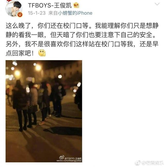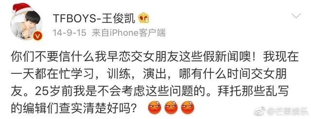 15岁时被造谣早恋发微博说“你们编辑别瞎写”,16岁时面对私生发微博说“早点回去别等我”。