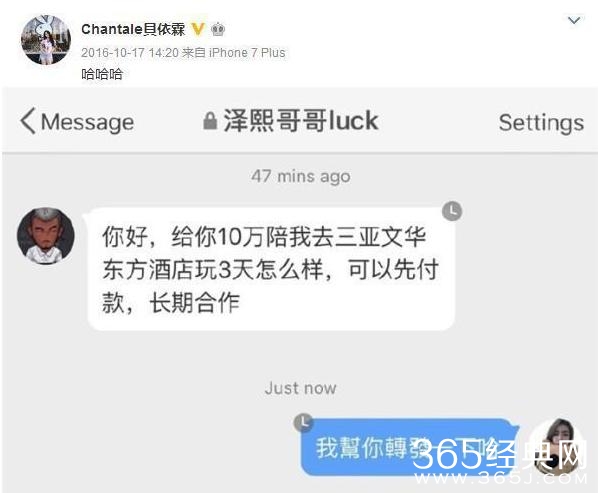因为许多网友认为这是一位爱钱的女孩子,便私信给她,说:你好,给你10万陪我去三亚文华东方酒店玩3天怎么样,可以先付款,长期合作。这位名叫贝易霖的女明星回应道:我帮你转发一下哈。