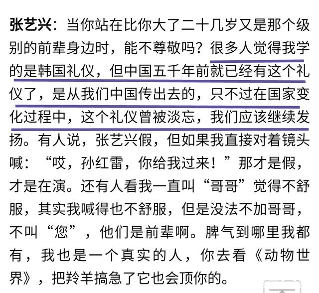 举个小编印象最深的访谈为例,15年的澎湃专访。众所周知韩国对练习生的要求相当严格,其中就包括礼仪这一项。小编也曾一度认为张艺兴的礼仪那么好是受韩国练习生那段时期的影响。当问到张艺兴的时候,他是这样回答的。