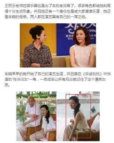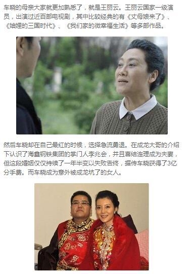 车晓的父亲叫车晓彤,代表作品《亮剑》等。他和王丽云相识与话剧团,两人当初是在朋友的撮合下结的婚,婚后才发现性格方面很多都很难适应,于是选择了和平离婚。