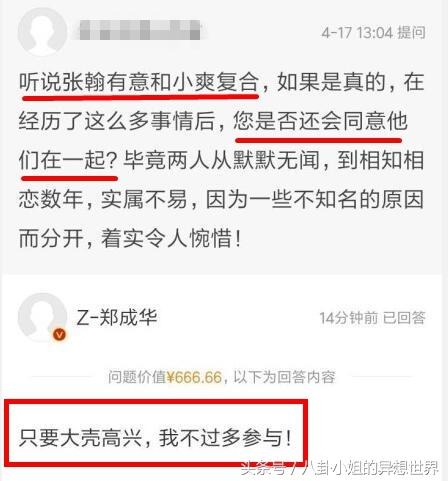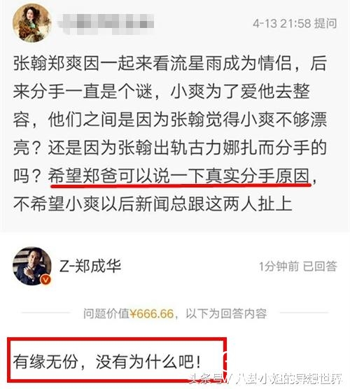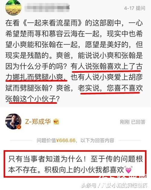 然而她亲爹却没有觉得尴尬!!郑爽爸爸在微博上回答了好多关于她前前任张翰的问题……比如,爽爸强烈否认了张翰劈腿的传闻,还说积极向上的小伙子他都喜欢。