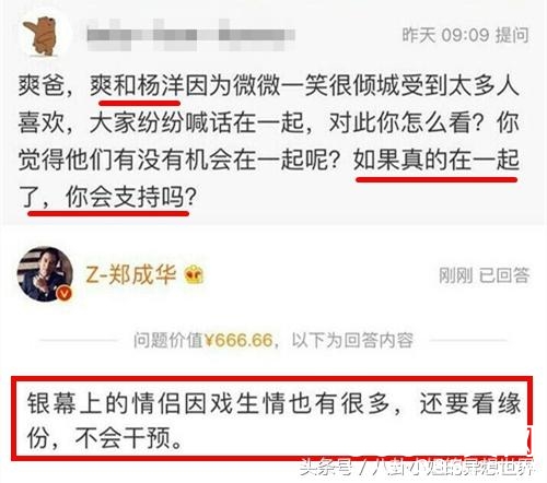 而且爽爸还对自家闺女与杨洋的CP乐见其成,他说:“银幕上的情侣因戏生情也有很多,还要看缘分,不会干预。”这个回答一出,杨洋的粉丝立马炸了……