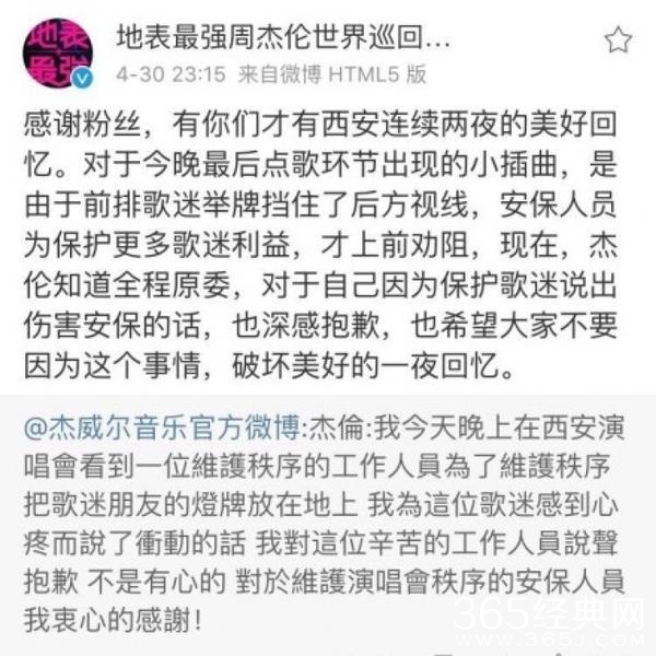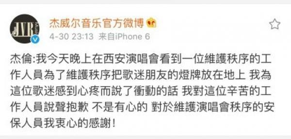 不过在演唱会结束后,立刻了解情况的杰伦通过公司官方微博以及演唱会主办方等各方公开向这位工作人员道了歉。