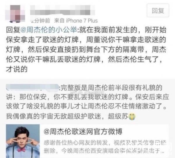 因为站在舞台视角的原因,台下的制止动作看起来会比较剧烈,女歌迷属于略微弱势,杰伦沟通未果才会如此动怒。但是了解了事情原委后,由于这位歌迷把灯牌举得太高,安保人员也是为了更多观众的利益才上前劝阻,这才发生了我们看到的一幕。