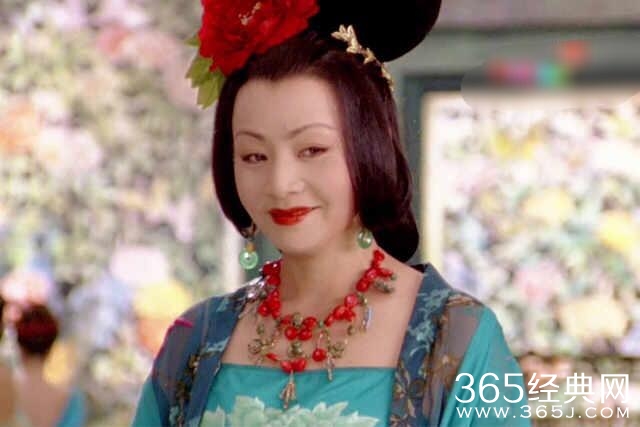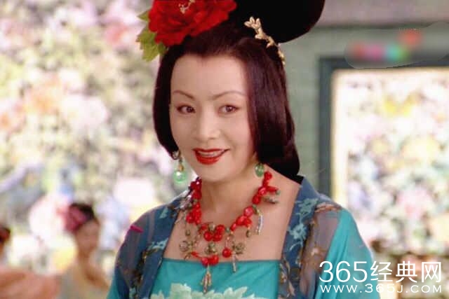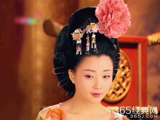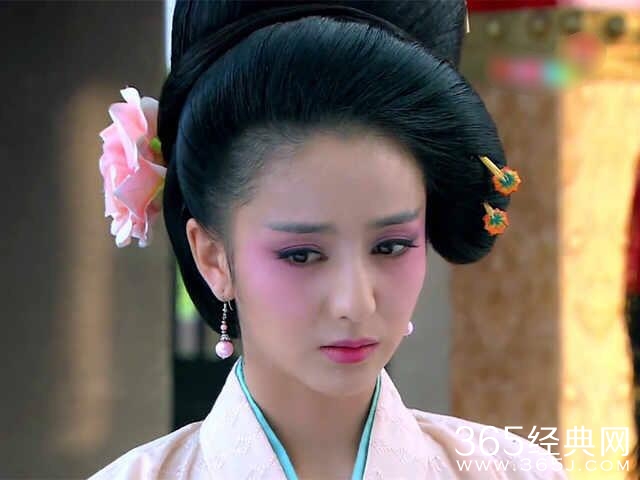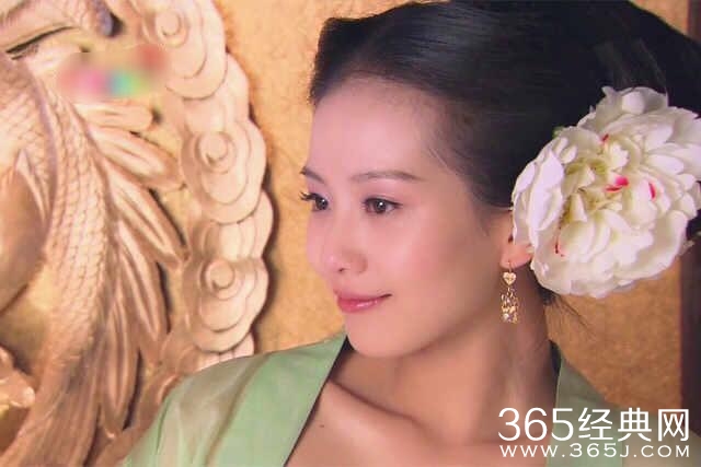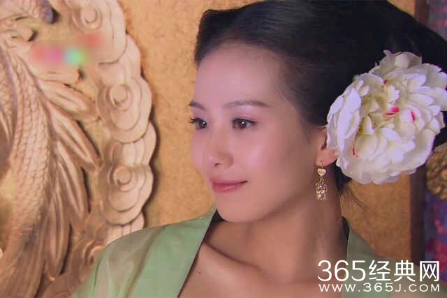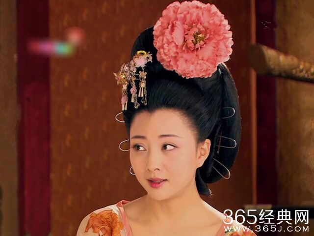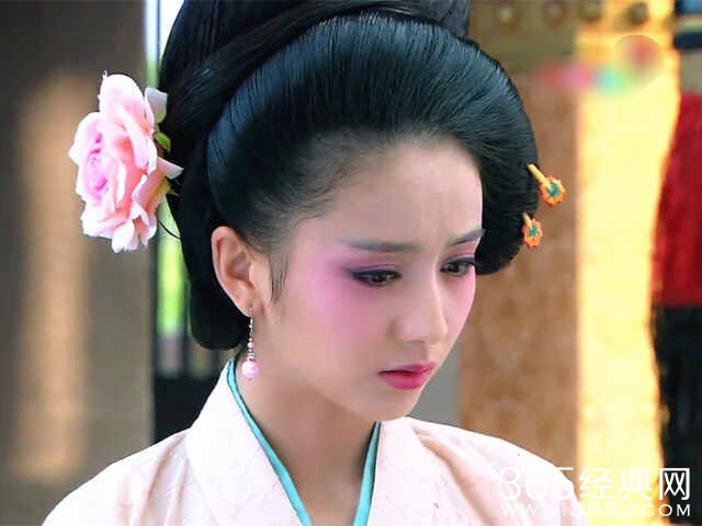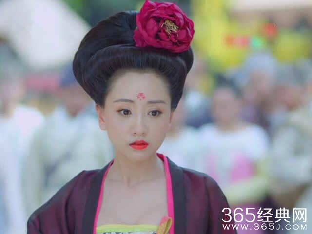 高耸的发髻,再插一朵盛放的牡丹,没有武则天应有的妩媚和霸气,殷桃属于小家碧玉型,这个装扮只能算的上温婉