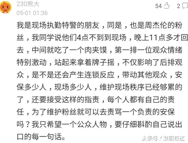 对于周杰伦的如此行为,有网友道出了当时的真实情况。保安维护现场秩序,对于现场的发展情况肯定比周杰伦清楚得多,最后却被骂,心里的委屈谁知道?