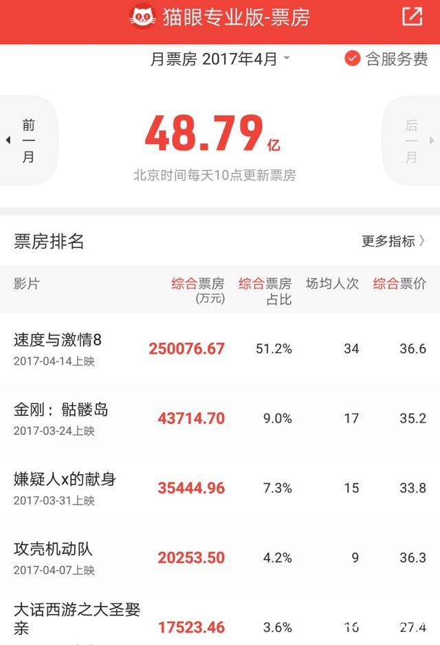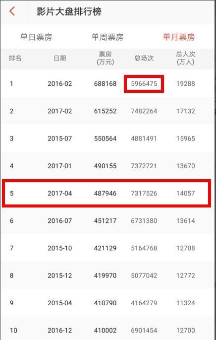 今年4月48.79亿元的票房成绩,在中国内地电影市场单月票房排行榜上名列第5名。占据单月票房榜冠军的依然是《美人鱼》上映的2016年2月。该月单月票房高达68.8亿元!短时间内恐怕难以超越。而且该月放映总场次只有5966475场,远不及今年4月的7317526场。总场次增加是因为银幕数的大幅增加,由此可见,单场票房下滑的趋势并没有改变,这也是中国电影市场的隐忧。