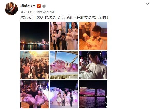 今天是杨威女儿双胞胎的百天庆,杨威在微博上发照片庆祝,可以看出party很温馨,一家五口看起来格外幸福。