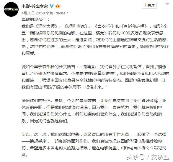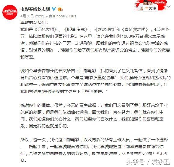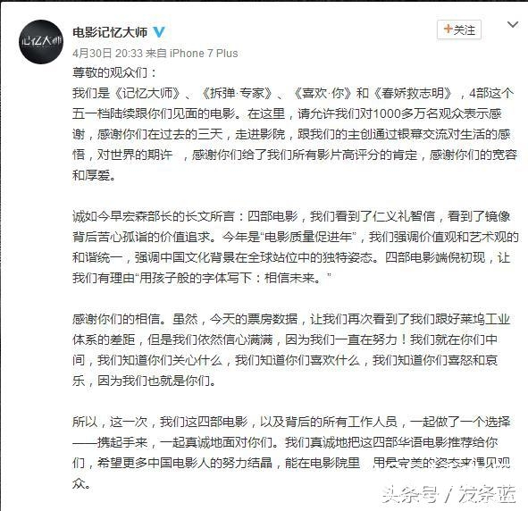 而昨天,也就是五一的第二天,《速度与激情8》毫无意外地登顶单日票房冠军。所以,其余几部国产片开始着急了,联合发布了以上的声明。