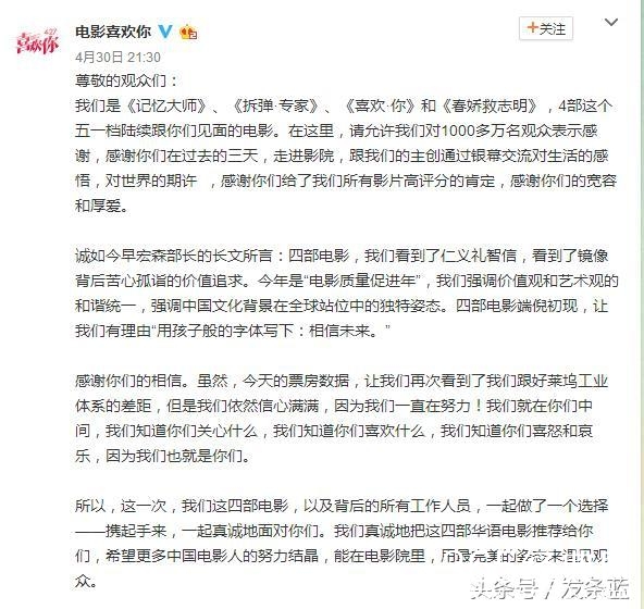 昨晚21:30,五一档上映的四部国产片《拆弹专家》、《春娇救志明》、《喜欢你》和《记忆大师》的官方微博同时发布了一条微博。