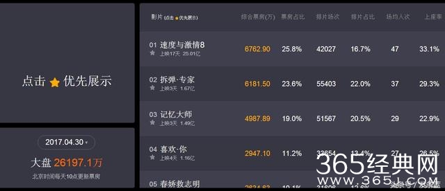 根据猫眼票房,四部电影同时在4月28日上映,上映首日,《拆弹专家》、《记忆大师》和《春娇救志明》拿下前三,《速度与激情8》排在第四,《喜欢你》第五。