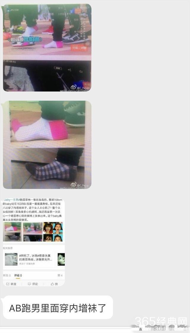 近日有网友爆料称,baby参加跑男时穿了内增高袜子,才与168cm的胖迪一般高。从网上流露出来的照片可以看出,baby的袜子却是比胖迪的袜子高出几公分。