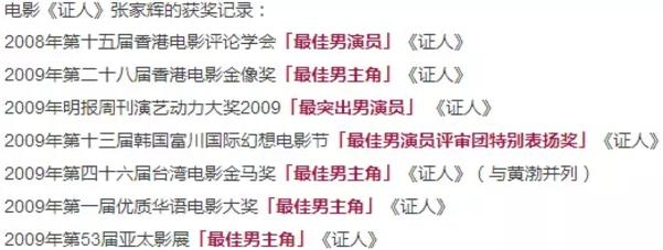 林超贤导演的《证人》、《激战》)两度让张家辉获得香港电影金像奖影帝,且《证人》让张家辉拿了7座影帝奖杯,打破了香港男演员凭同一部戏获奖最多的纪录。