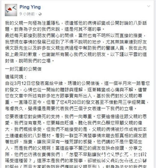 平云透露,琼瑶曾告诉他们:「对我来说,你们的父亲已经是一具没有灵魂的肉体,从今以后请你们自己照顾,我要去过我自己的生活了。」平云向琼瑶喊话:「既然如此,就请将父亲还给我们吧,这是我们最沉痛的请求。」