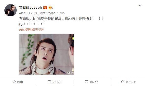 巧合的是,曾舜晞曾在微博中对自己的大眼睛感到信心满满,表示,“在看择天记,我觉得我的眼睛大得恐怖!是恐怖!”,一句话后面全是感叹号,连他本人都震惊到了,何况是吃瓜群众呢?