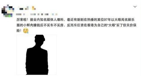 该曝料直指目前有新剧正在热播的以大眼闻名娱乐圈的小鲜肉,97年生人,买天价保险的地点为香港。
