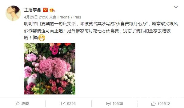 最近,“李湘自爆一月伙食费7万”突然冲上了微博热搜,原因是在一档综艺节目上,李湘被爆伙食费至少要七万,后来被李湘更正为一万,她在自己的微博上也专门发了微博澄清。