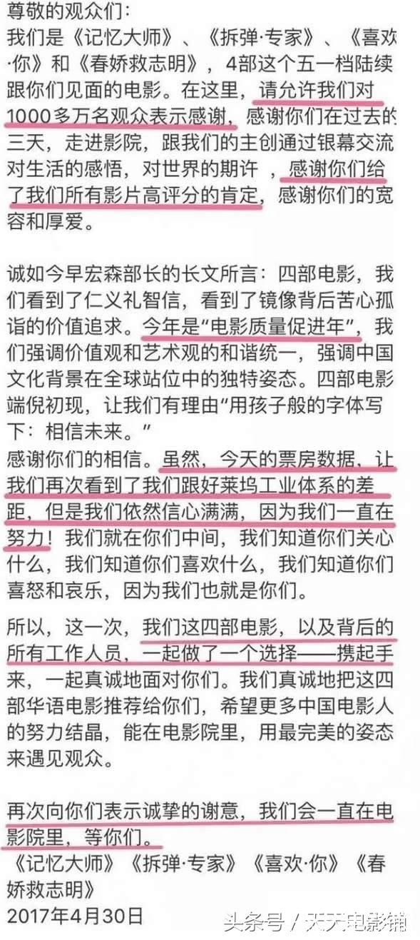 电影的口碑和票房不是喊出来的,上述的四部电影其实评价也不差,但是你搞个这样的声明是不是有点卖惨的感觉。