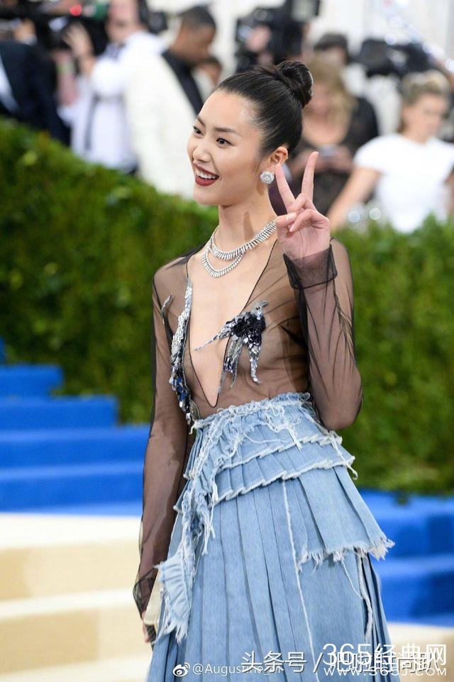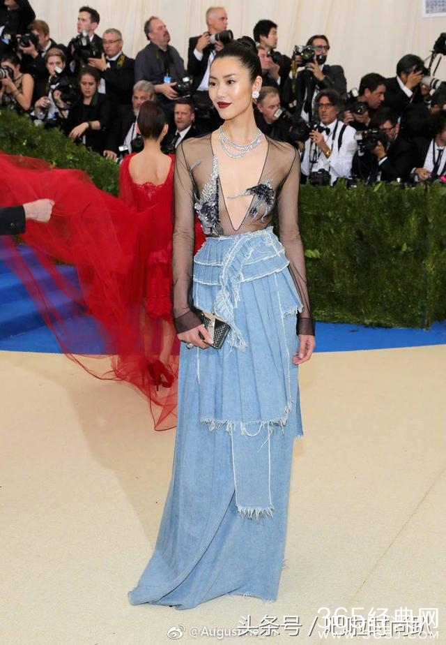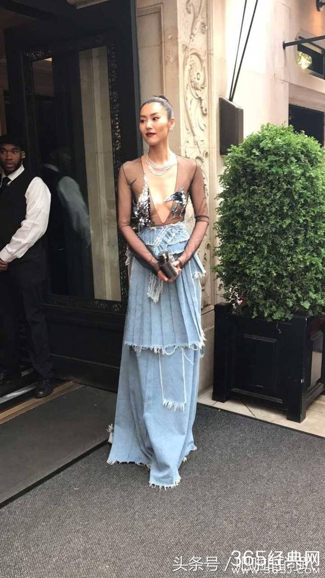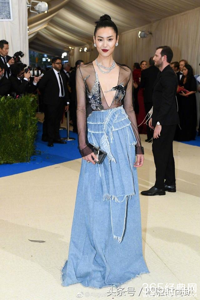 刘雯身上穿的是Off White定制的礼服,礼服非常特别,上衣是超级大胆的网纱深V,性感的不要不要的,下身竟然拼接了牛仔长裙,还有不规则的毛边设计,这么鬼马又出彩的设计,真是太切题了!