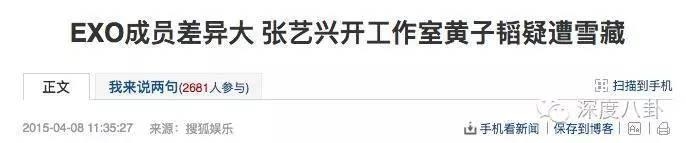 再说“四子”中的另一位张艺兴,黄子韬和他也有些过节,双方粉丝的骂战曾经闹的声势浩大。起因是2015年4月初,也就是黄子韬回国前夕,媒体纷纷报道公司将为张艺兴在国内开工作室,而黄子韬“被雪藏”。