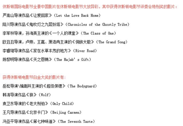那么上网查查这个休斯顿电影节究竟如何呢?通过获奖作品可以看到,休斯顿电影节整体上更喜欢中国元素一点,这么说吧,央视的中秋晚会分别在06年和09年拿了大奖。去年的最佳男主角是孙海英,最佳导演是陆川,下附去年的获奖明细: