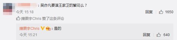 随后在底下回复网友评论称吴亦凡将要演王家卫的电影《繁花》。↓