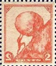 邮票上画的是希腊神话中的人物西西弗斯,被罚推巨石上山,每次都功亏一篑,无休无止。
