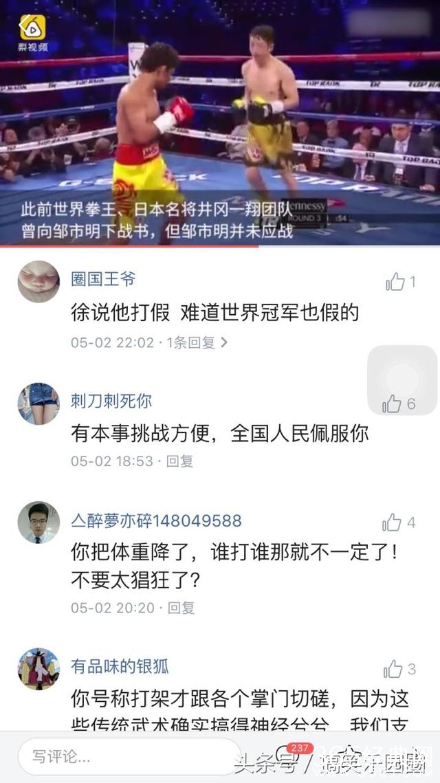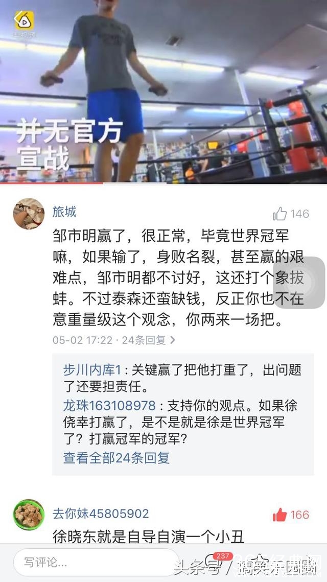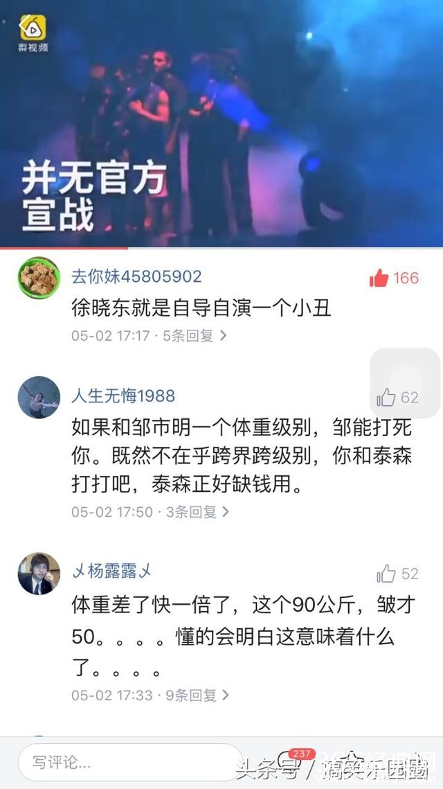 近日有关于徐晓东跟太极雷公的事件真可谓是近期的热门事件了,要小编觉得这样的炒作也太嚣张了,小打小闹也就算了,你扯什么世界冠军,你有啥资格跟人家打,你跟他打可以,但是你先去报名然后最后决赛见,这样你就可以跟他打了,哦,对了你也不看看你的级别应该是跟泰森一个级别的,祝你好运。